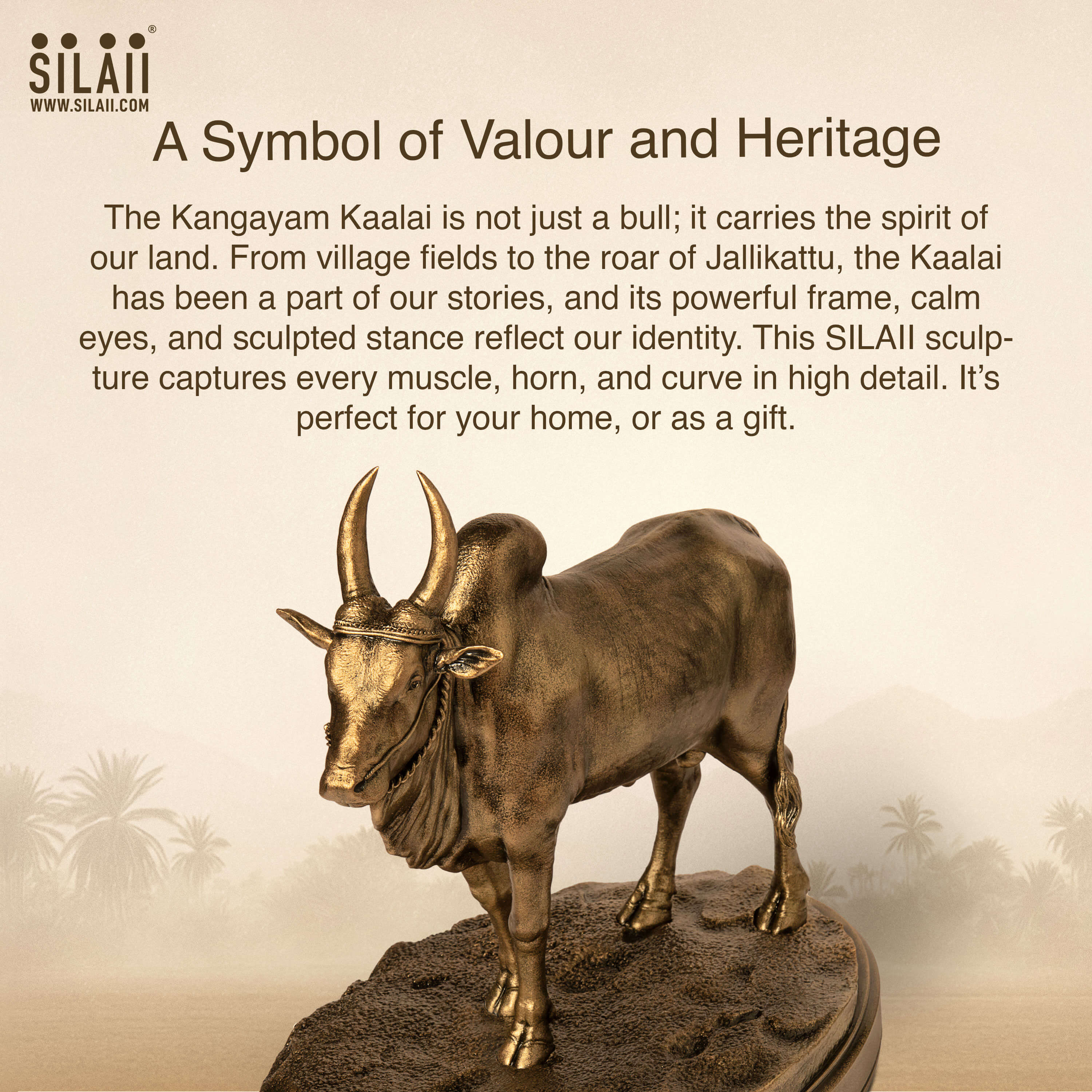 It stands for strength passed down through generations, for lives built on hard work, and for traditions that still live on in our hearts.From village fields to the roar of Jallikattu, the Kangayam Kaalai has been a part of our stories, steady, proud, and unshaken. Its powerful frame, calm eyes, and sculpted stance reflect more than form; they reflect identity.