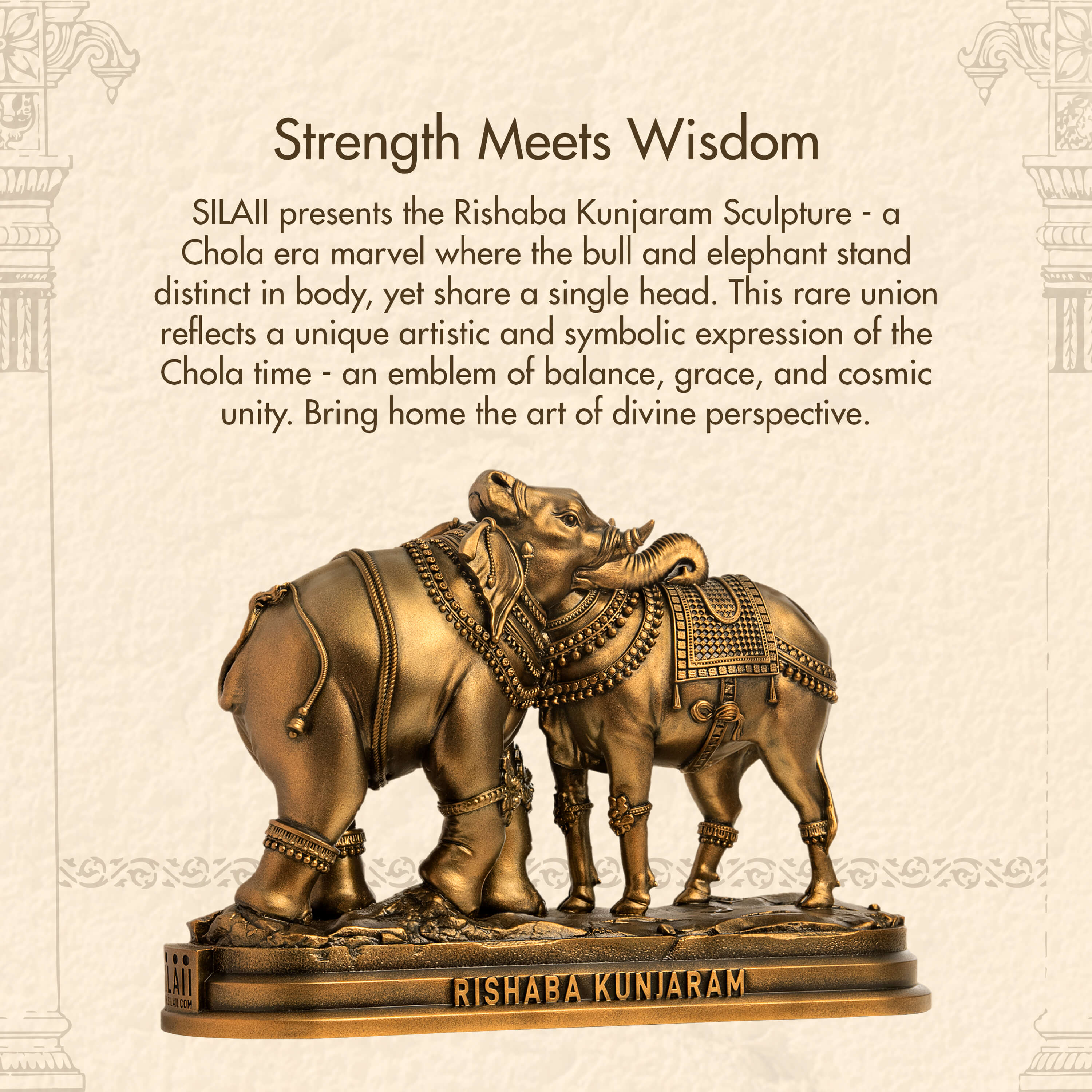 This remarkable sculpture brings to life one of the most intriguing creations of Chola artistry - the Rishaba Kunjaram. At first glance, it appears as a bull and an elephant. Look closer, and you see they share a single face. Two mighty beings carved as one, asking us to step beyond form and discover meaning.